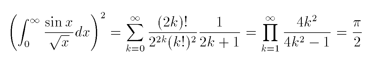 たとえば、上記のような複雑な式でも、¥[ ¥left(¥int^¥infty_0 ¥frac{¥sin x}{¥sqrt x}dx¥right)^2 = ¥sum^¥infty_{k=0}¥frac{(2k)!}{2^{2k}(k!)^2}¥frac{1}{2k+1} = ¥prod^¥infty_{k=1}¥frac{4k^2}{4k^2-1} = ¥frac{¥pi}{2} ¥]と書けば出力できるのだ。なれないと難しいように感じるかもしれないが、タグの意味さえわかってしまえば簡単である。
